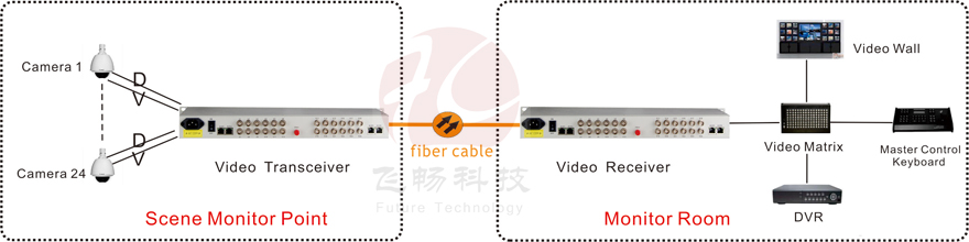This digital video optical transceiver adopts digital video encoding and gigabit optical fiber transmission technology. The multi-channel single-direction bi-direction audio, video, data, telephone, Ethernet and switch real-time synchronization, no-distortion and high quality transmission is on the single-core or dual-core optical fiber. Complete digital video non-compression transmission technology, with video and data condition indicator, can monitor the system normal operation. It uses modular design, the user can flexibly select or customize configuration based on the scene occasion. Rack installation or desktop installation can be optional. This product is made up of optical transmitter and receiver. It can transmit 24Channel forward direction Video and 1Channel reverse direction RS485 data.