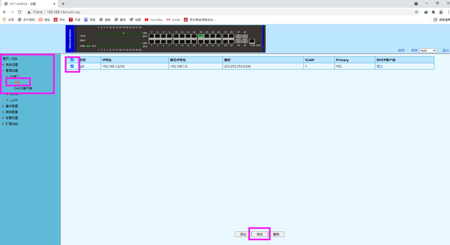 3、登錄后在導(dǎo)航欄中:[管理設(shè)置]—[IP接口]—[設(shè)置]中勾選當(dāng)前IP設(shè)置然后點(diǎn)擊下方[修改]按鍵。