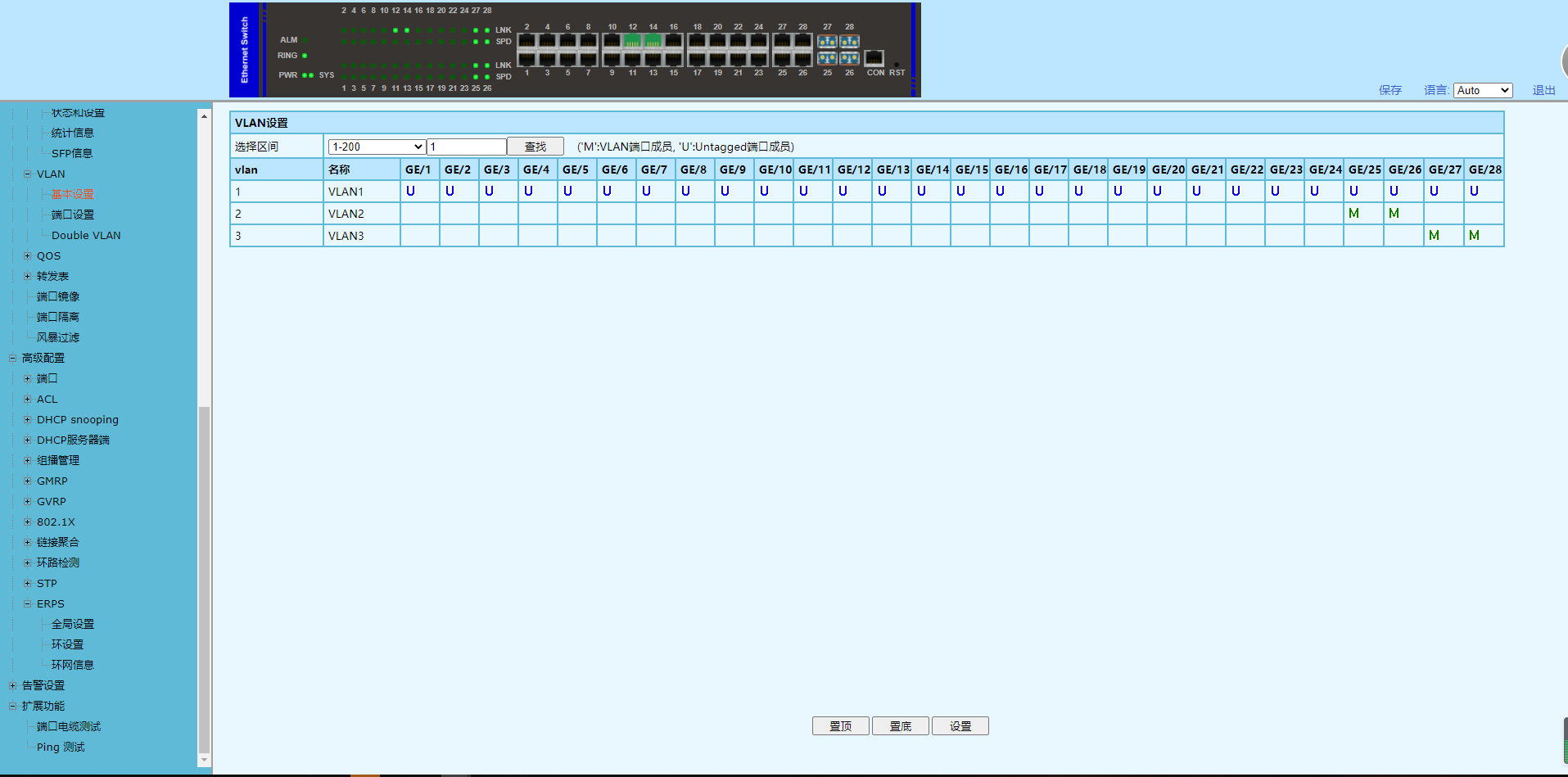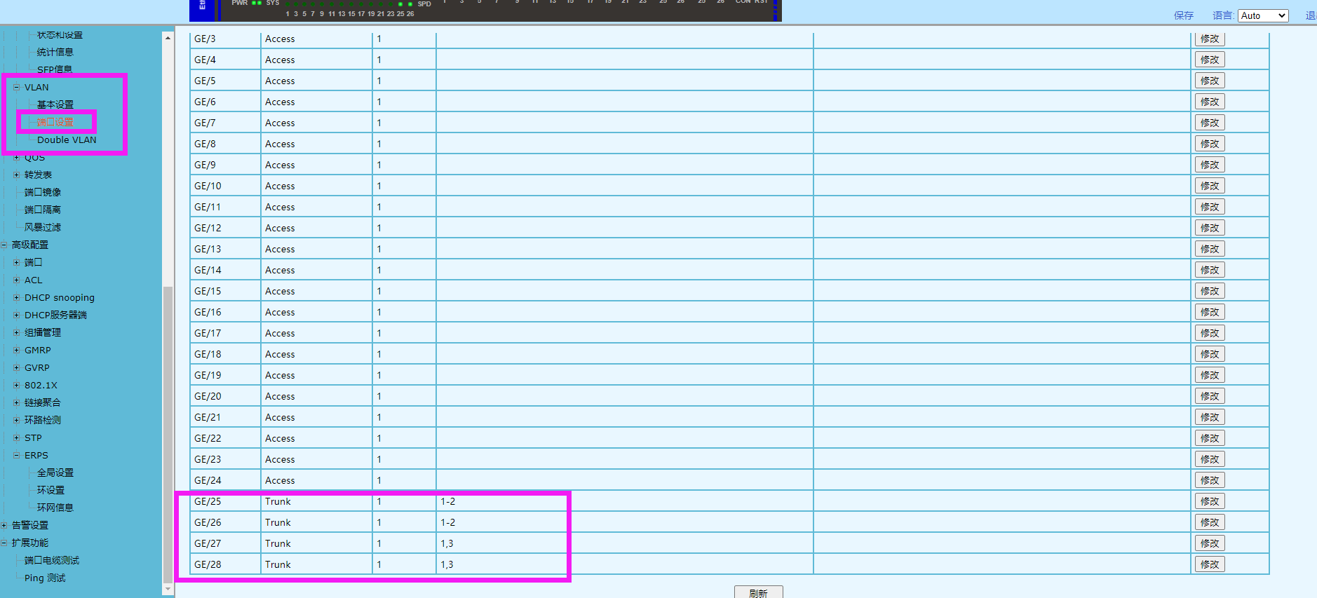2、VLAN2成員為GE/25、26端口;VLAN3成員為GE/27、28端口。且端口模式為“Trunk”;在:[基本配置]—[VLAN]—[端口設(shè)置]中修改配置