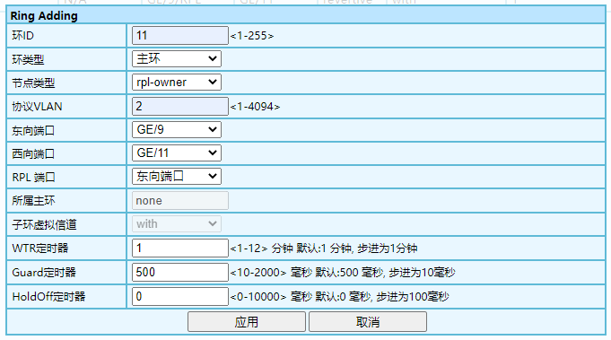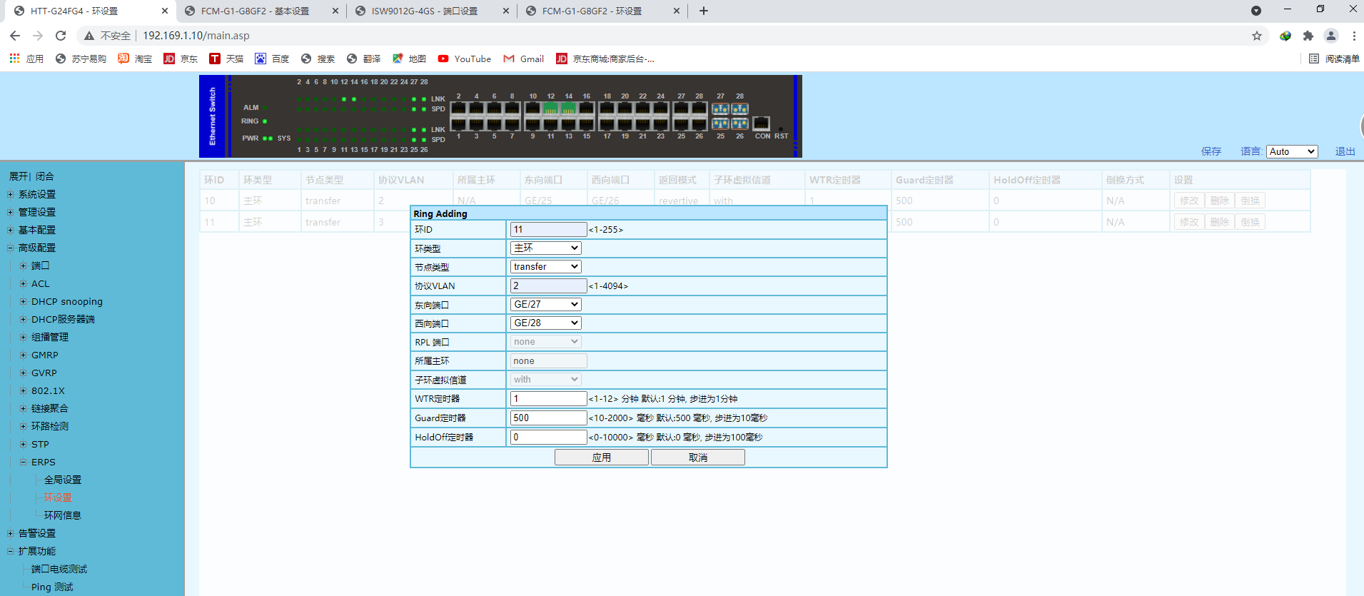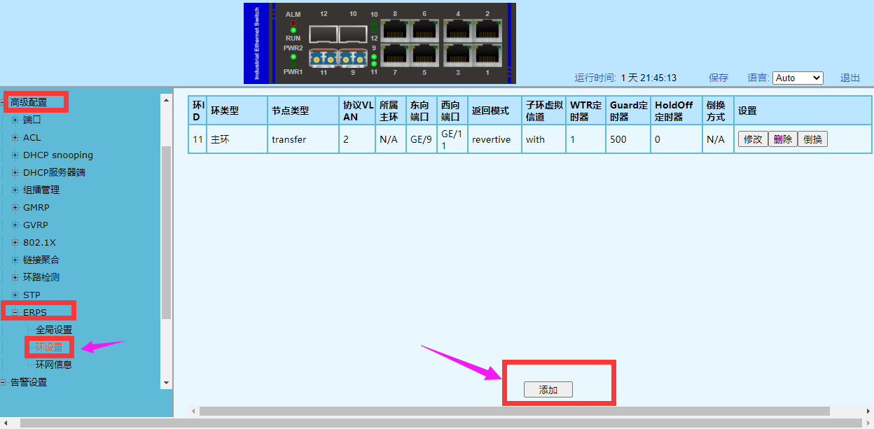 2、在導(dǎo)航欄選擇:[高級配置]—[ERPS]—[環(huán)設(shè)置]中點(diǎn)擊添加,打開設(shè)置窗口