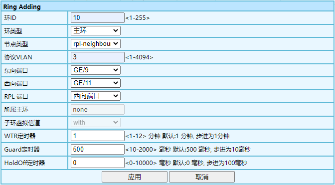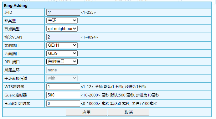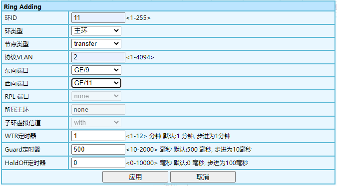 1、對匯聚節(jié)點(diǎn)“10”進(jìn)行設(shè)置;節(jié)點(diǎn)類型選擇為transfer;用于環(huán)一的端口為GE/25、26;協(xié)議VLAN用預(yù)設(shè)好的VLAN2。  環(huán)二設(shè)置:節(jié)點(diǎn)類型選擇為transfer;端口為GE/27、28;協(xié)議VLAN用預(yù)設(shè)好的VLAN3。