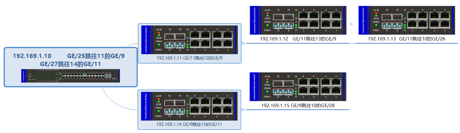 4、其余節(jié)點(diǎn)設(shè)備按照預(yù)設(shè)修改好配置,通過端口鏈狀連接到一起(在FC4M-G24G端口先不成環(huán))。測試VLAN是否達(dá)到預(yù)期,連接是否正常。(修改完后一定要記得保存)