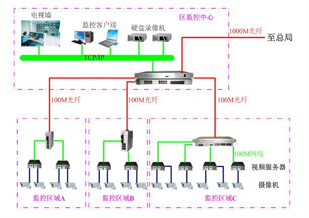 在不同的監(jiān)控區(qū)域,選擇使用不同的交換設(shè)備,如在視頻服務(wù)器不多地區(qū)域使用5端口或8端口交換機(jī),而在視頻服務(wù)器數(shù)量較多的區(qū)域使用16或24端口交換機(jī),并使用交換機(jī)的光纖接口使用專用光纜傳輸至區(qū)監(jiān)控中心,由全光口光纖交換機(jī)對(duì)數(shù)據(jù)進(jìn)行匯聚,由交換機(jī)的1000M網(wǎng)絡(luò)接口傳輸至硬盤錄像機(jī)和電視墻。而至總局的傳輸則使用1000M光纖接口來(lái)實(shí)現(xiàn)。